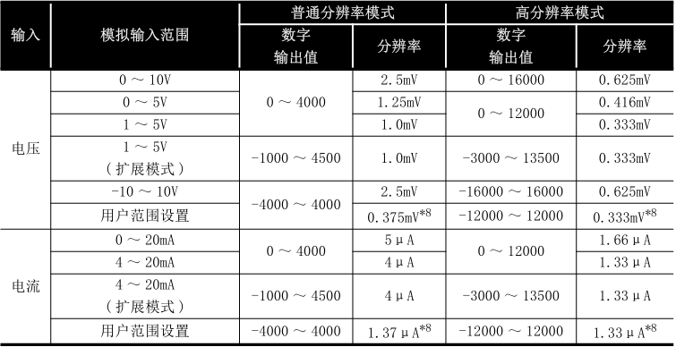 [模擬輸入點(diǎn)數(shù)] 8點(diǎn)(8通道)[模擬輸入] 電壓DC-10~10V(輸入阻抗1MΩ及以上),電流DC0~20mA(輸入電阻值250Ω)